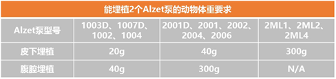 埋植多個(gè)Alzet泵必須確保動(dòng)物體重足夠大,能容納多個(gè)泵的大小和重量。下表總結(jié)了埋植2個(gè)指定型號(hào)給藥泵時(shí)動(dòng)物需要滿(mǎn)足的最小體重。