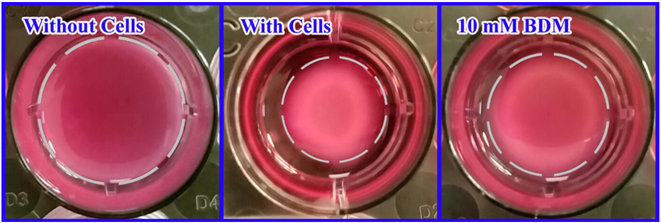 根據(jù)實驗方案(上圖),虛線表示凝膠邊緣,用尺子分別測量無細(xì)胞組、有細(xì)胞組和10mM細(xì)胞收縮抑制劑BDM處理組的膠原基質(zhì)的直徑(單位:mm),對比BDM處理組與對照組細(xì)胞收縮的變化。