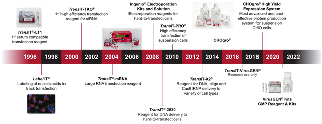 西美杰代理的美國(guó)Mirus公司成立于1995年,是世界上很早開發(fā)高效、低毒轉(zhuǎn)染試劑的公司,同時(shí)也是該類試劑的主要供應(yīng)商之一。其產(chǎn)品線涵蓋化學(xué)轉(zhuǎn)染試劑、電轉(zhuǎn)染產(chǎn)品、病毒生產(chǎn)和轉(zhuǎn)導(dǎo)產(chǎn)品,適用于基因功能研究、蛋白生產(chǎn)、病毒載體生產(chǎn)和動(dòng)物模型構(gòu)建等領(lǐng)域。Mirus被公認(rèn)為轉(zhuǎn)染試劑開發(fā)的領(lǐng)跑者,其許多杰出成果獲得世界公認(rèn)與廣大用戶的好評(píng)。