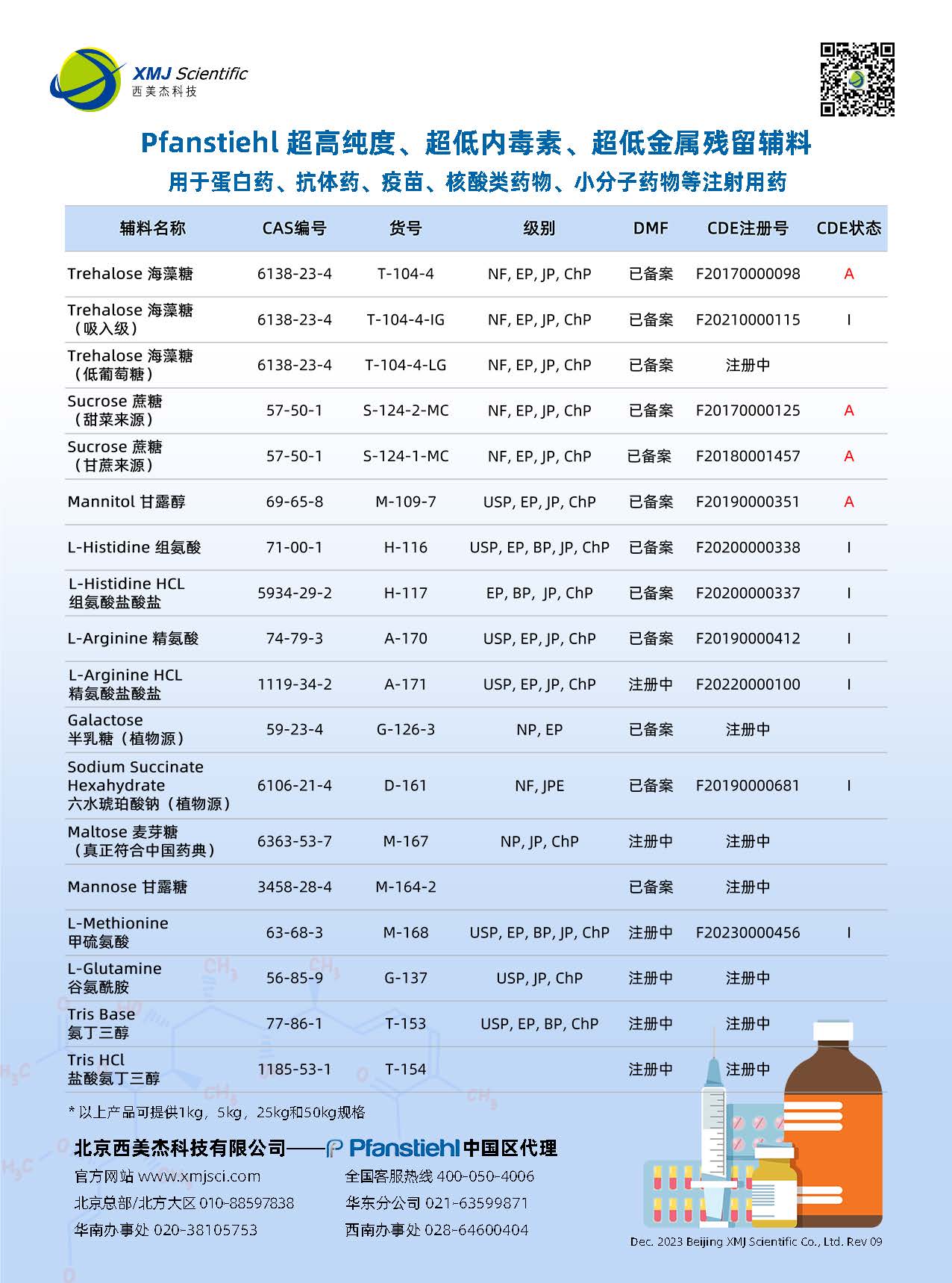Pfanstiehl Inc.成立于1919年, 公司總部位于美國芝加哥市北郊沃吉根工業(yè)區(qū),是美國老字號企業(yè)之一,也是一家真正的cGMP生產(chǎn)商。作為一家有著百年基業(yè)和沉淀的公司,Pfanstiehl Inc立志將產(chǎn)品質(zhì)量做到極致,是全球生物制藥領域超純糖類、氨基酸類以及其他尖端分子的領先生產(chǎn)商,迄今已服務全球蛋白藥、抗體藥、疫苗、mRNA及核酸類藥物等領域100年以上。Pfanstiehl Inc. 超高純度、超低內(nèi)毒素,超低金屬離子含量的輔料制劑產(chǎn)品,全面的技術(shù)和法規(guī)審計支持,真正的cGMP質(zhì)量控制體系,接受FDA的定期監(jiān)察審計等都被國際知名生物制藥公司所認可。Pfanstiehl Inc.是全球超高純度、超低內(nèi)毒素、超低金屬離子含量等注射級糖類的領先制造商,產(chǎn)品生產(chǎn)均參照ICHQ7質(zhì)量體系。自2015年進入中國市場以來,Pfanstiehl Inc.已獲得13個 CDE登記號,主要產(chǎn)品含括海藻糖,蔗糖,D-甘露醇,組氨酸,組氨酸鹽酸,精氨酸,精氨酸鹽酸,琥珀酸鈉,甲硫氨酸等,其中海藻糖F20170000098,甘蔗源蔗糖F20180001457和甜菜源蔗糖F20170000125, D-甘露醇F20190000351的CDE號均已激活。 Pfanstiehl Inc.于2023年又重磅推出注射級Tris和Tris HCl,這將是全球高質(zhì)量的Tris和Tris HCl。作為一家有著百年歷史的企業(yè),Pfanstiehl Inc. 也在持續(xù)投資,不斷擴充產(chǎn)品管線和擴大生產(chǎn)產(chǎn)能,以滿足和支持全球生物制藥行業(yè)的快速發(fā)展,特別是更好的助力中國生物制藥的發(fā)展需求。