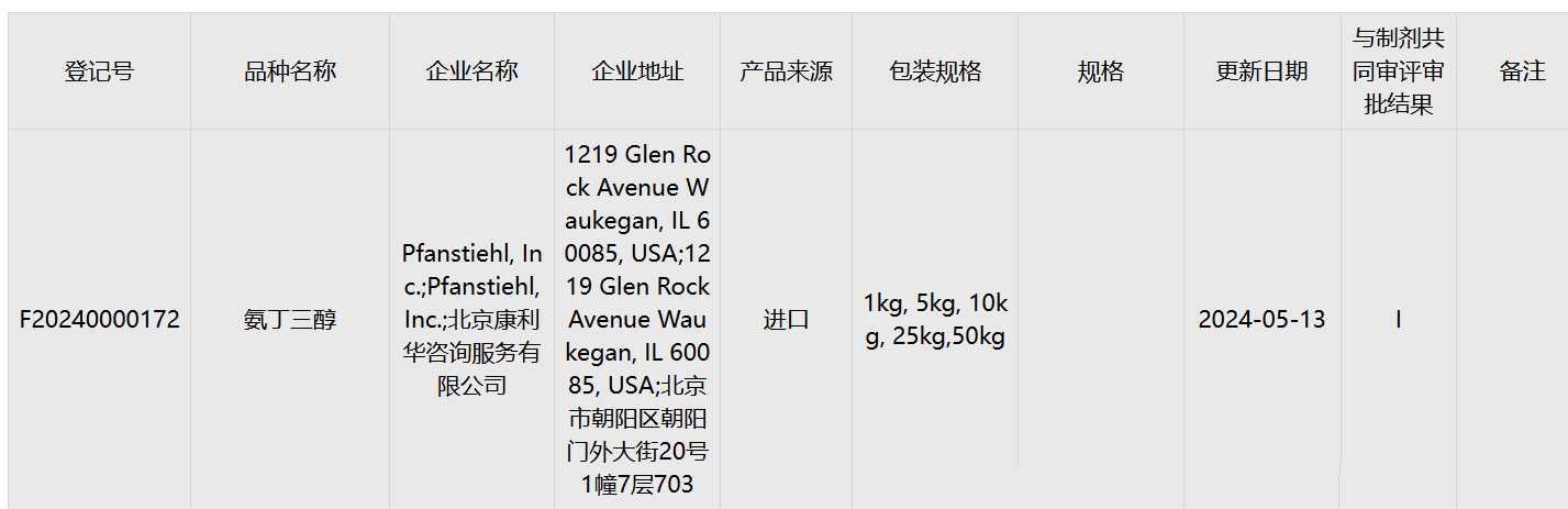 Pfanstiehl 喜獲第15個(gè)CDE登記號(hào)- 氨丁三醇Tris Base
