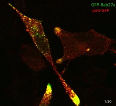AtT-20轉(zhuǎn)染表達(dá)GFP-Rab27a后用GFP抗體免疫染色結(jié)果