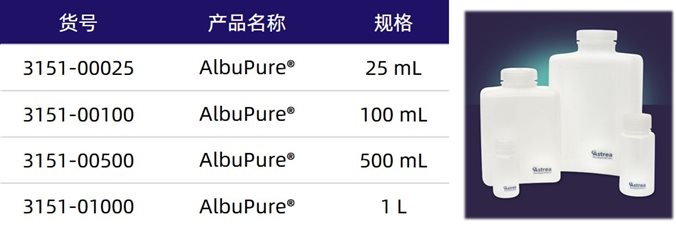 AlbuPure®是Astrea Bioseparations和Albumedix公司合作開發(fā)的白蛋白親和層析填料,填料基架是粒徑均一的高交聯(lián)瓊脂糖,配基是合成的三嗪化合物,具體高流速、高動(dòng)態(tài)結(jié)合載量、強(qiáng)化學(xué)耐受性等特點(diǎn),主要用于白蛋白融合蛋白的純化。AlbuPure®的性能參數(shù)如下表所示。