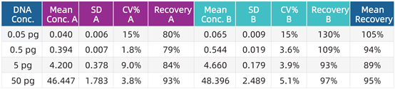 準(zhǔn)確性與可重復(fù)性測試。由兩名操作員(A和B)分別在兩天內(nèi)對已知DNA樣本進(jìn)行兩次檢測,計(jì)算檢測結(jié)果的SD, CV和回收率%(見下表)。