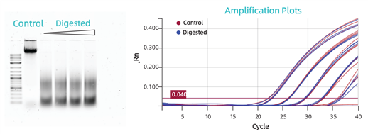 完整的和不同程度降解的CHO DNA的提取與擴(kuò)增效果對比。將完整的gDNA(Control)與分別用Alu1酶處理30min、1h、1.5h和2h后的DNA(Digested)凝膠電泳圖像。對照組和酶處理30min組樣品擴(kuò)增的線性范圍基本一致(如下圖)。