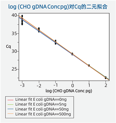存在外源DNA的情況下,CHO引物/探針仍具有廣泛的線性范圍和特異性。不同濃度的E. coli DNA不會影響CHO DNA的標(biāo)準(zhǔn)曲線(如下圖)。