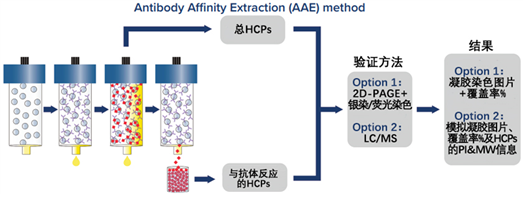 AAE分析流程首先將多克隆抗體共價固定在色譜柱上。然后對色譜柱進行條件調(diào)節(jié),以防止抗體的顯著浸出并極大地減少任何非特異性結(jié)合。原始未變性的HCPs樣品通過色譜柱與抗體進行結(jié)合,隨后用酸洗脫。通過結(jié)合和洗脫,HCPs樣品再次在柱上循環(huán),直到?jīng)]有其他HCPs被結(jié)合。所有收集的HCPs洗脫液再匯集、交換緩沖液并濃縮回原始樣品體積,為后續(xù)的分析提供高質(zhì)量的樣本。在收集到HCPs樣本后,可以選擇通過2D-PAGE+銀染或MS質(zhì)譜進行后續(xù)分析。
