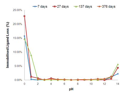 在室溫條件下,在從pH 0.0(1 M HCl) 到pH 14.0 (1M NaOH) 的一系列測(cè)試溶液中孵育的APB A6XL的pH穩(wěn)定性曲線。收集上清液樣品并以連續(xù)暴露1周至1年的特定時(shí)間間隔測(cè)定配基的脫落情況。