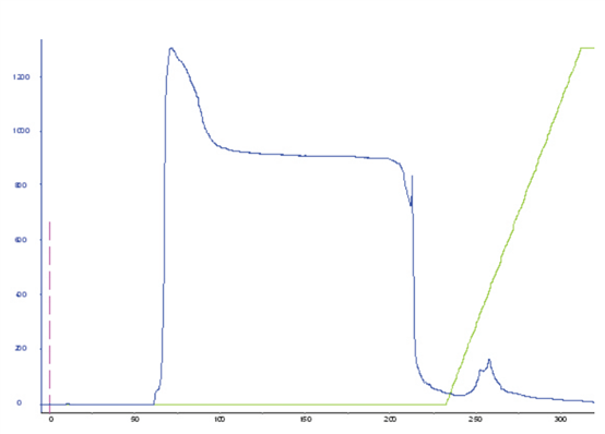 APB層析填料特別適用于糖蛋白的捕獲和純化。下圖展示了一個(gè)經(jīng)典的親和純化色譜圖,其中有一個(gè)大的流穿和一個(gè)小的離散洗脫峰。在50 mM山梨醇洗脫后達(dá)到完全的目標(biāo)糖蛋白回收。